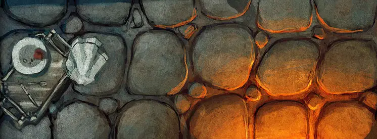 The various room tiles also have a number of graphical features, such as crystals jutting up from the ground or plates of discarded food. Any such features are not considered to be their own spaces, but are either part of the space they are within, like in the case of the skull in the Alchemist Chamber or the helmet in the Guardroom, or in-between spaces, like in the case of the crystals in the Crystal Tunnels. Board features in-between spaces can only be moved through if they fit the rule of thumb for moving between spaces described earlier.
