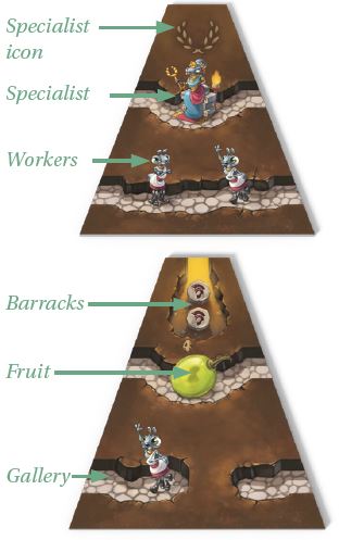 2 Colony: 5 victory points for the player(s) with the most ants (specialists and workers) in one Gallery.