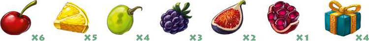 There are six different types of fruits: cherry, lemon, grape, blackberry, fig, and pomegranate. The gift is a wild fruit. Each Gallery will give you a bonus of 2-5-10-15-20 or 25 victory points for 1-2-3-4-5 or 6 different types of fruits in that Gallery.