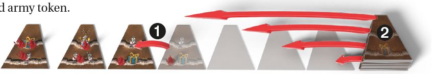 Example: Matt chooses the 3rd Anthill tile in the line. In order to take it, he must place one Soldier from his army on the 1st tile of the line and another one on the 2nd tile of the line.