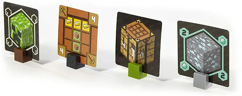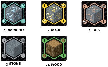 Shuffle all the Resource Cards (Wood, Stone, Iron, Gold, Diamond, Wild, Creeper and TNT). Next, deal them FACE DOWN into 5 piles of 15 cards each. Then turn each pile OVER so that all the cards in each pile are now FACE UP.