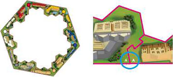 Put the tile with "The Big City" (+5 hex) in the center, and the remaining 6 map tiles randomly around it. All tiles are double-sided, and the facing & orientation is also random.