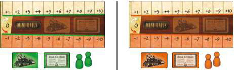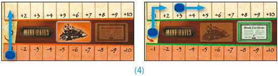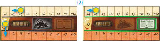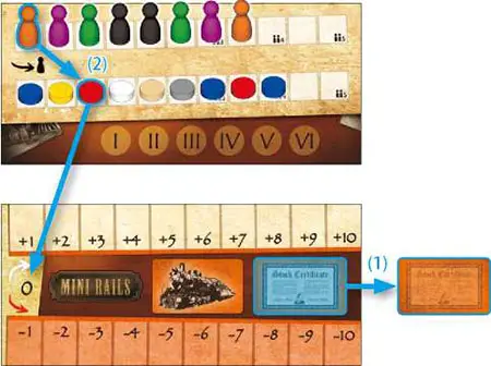 2Then he takes his order marker on the left and uses it to replace a red rail disc on the market track, and puts it on the "0" space of his Profit Board.![]()