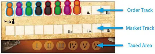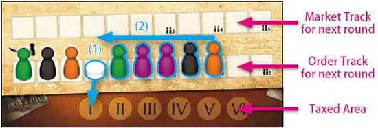 In the action phase of each round, players will be moving their markers from the order track to the market track.