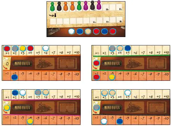 - Move player markers to the left as needed to fill the empty space on the market track. This will be the player order for the next round.