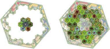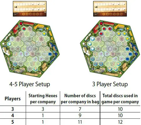 According to the number of players, put the correct number of Company Discs in the draw bag and 1 or 3 Company Discs of each color on the starting hexes of the map, next to their respective frame colors.