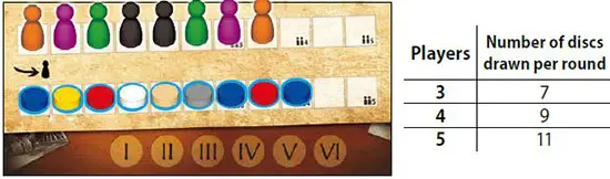 Randomly draw the specified amount of Company Discs from the bag according to the amount of players (twice the number of players, plus one), and place them from left to right on the (empty) market track of the market board.