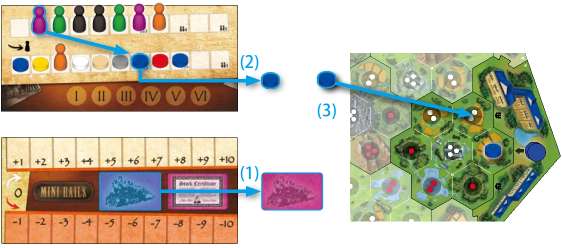1It is the Purple player's turn, and she chooses to build tracks for the blue company.2She takes her marker and uses it to replace a blue disc on the market track.3Then she takes the blue disc and places it on an empty hex adjacent to another blue track on the map.