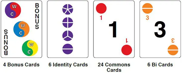 Each of the Common, Bi, Tri, Quad and Quint cards has a point value which appears in the center of the card; the Bonus and Identity cards function only as reference cards and thus have no point values.
