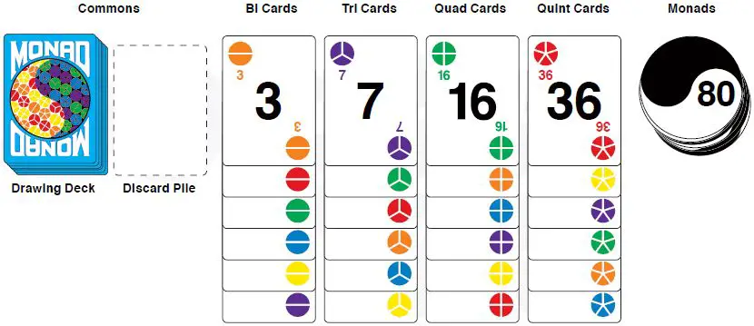 Arrange the Bi, Tri, Quad and Quint cards in columns in the center of the table as shown. Stack the 10 Monads (disc-shaped objects) face up to the right of the Quint cards. Deal six Commons, one at a time, face down to each player.