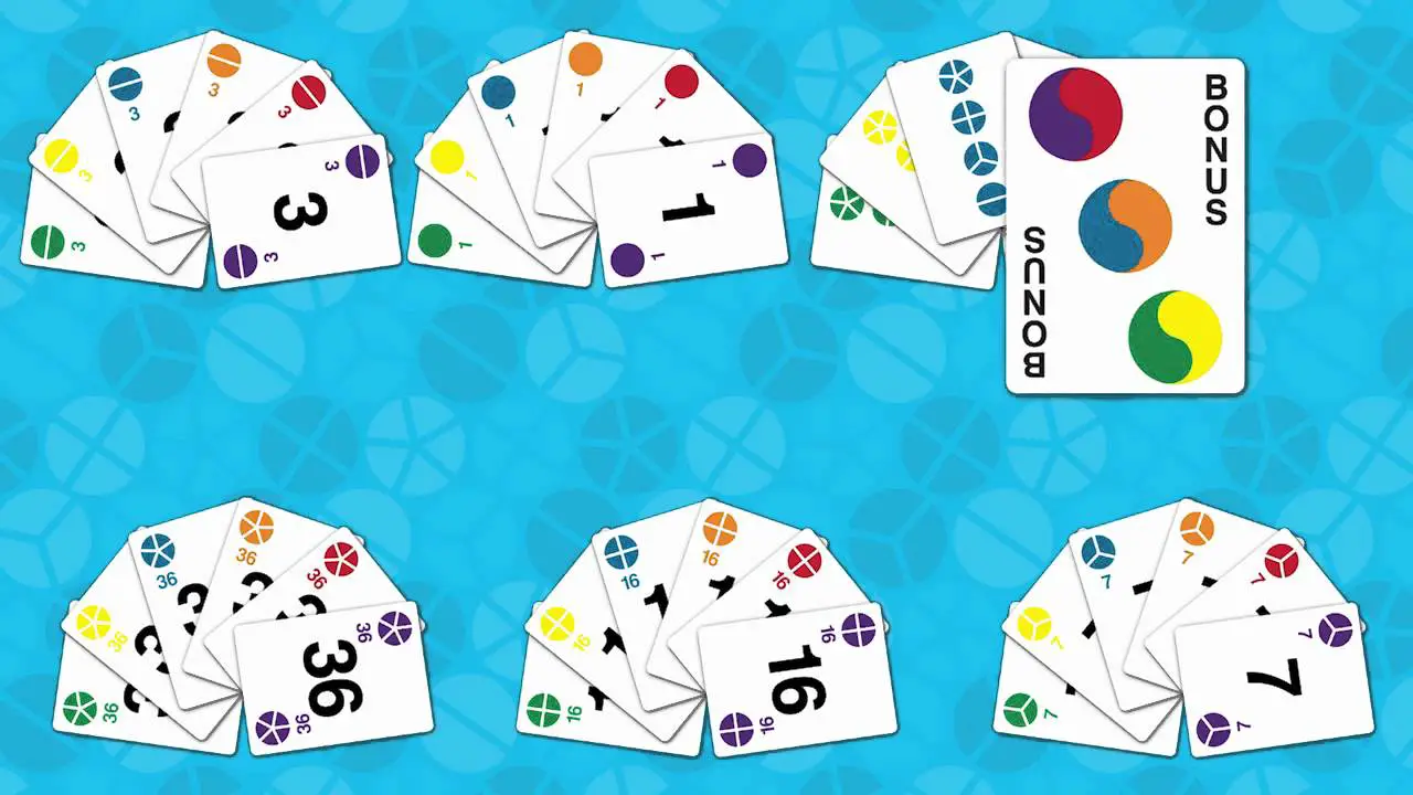 Each Bonus card shows three bonus combinations of these colors (red/purple, orange/blue and yellow/ green); only one of the six colors appears on each of the other cards.