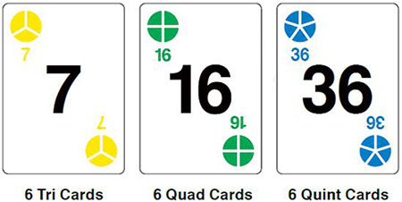 The special deck of playing cards is sorted into seven different sets, as shown below. Each set contains six different colors - three warm colors (red, orange and yellow) and three cool colors (purple, blue and green).