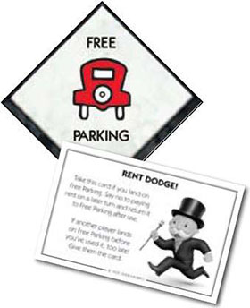 When you land on FREE PARKING, collect the Rent Dodge card from beside the board.