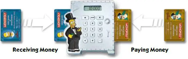 The payer's balance will go down. When the money has been transferred, the recipient's balance will go up. Banker, remove both cards.