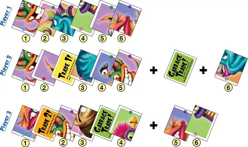 The player then discards a Monster Piece card to the top of the Garbage Pile, to stay at exactly 6 Monster Piece cards. The player must play the Garbage Trade card before looking through the Garbage Pile.
