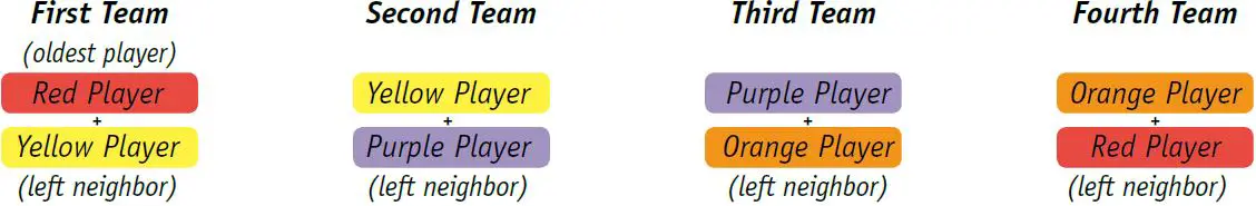 The oldest player and the player on his or her left start as the first team. The following example shows how the teams are formed.