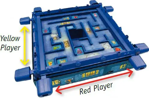 When it is your team's turn, you must decide who is responsible for which pair of sliders on each side of the mansion: One player controls the vertical sliders, while the other player controls the horizontal sliders. See the example below. Put the mansion between both of you so that each player can reach both of the sliders.
