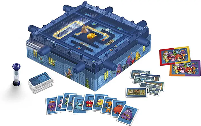 The monster cards show which monster must be captured next. Use the sliders to push the monster as quickly as possible to the middle of the mansion and into the monster trap! You will have to work together on teams to do this.