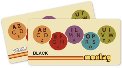 In Montage, each of the 5 different colored chips represents 5 or 6 letters of the alphabet and so all words are made with colors! The side that earns 4 zones first is the winner.