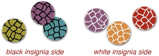 If a pip has already been placed on one of the yellow circles as part of the game pattern, that circle is skipped in seeding. Chips used in seeding are placed with either a black or white insignia face up conforming to the black and white inner circles on the large diamond.