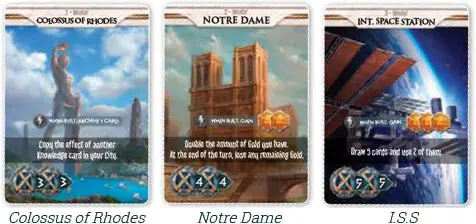 The game also comes with three alternative Wonders for Eras I, II and III (one for each Era). You may swap each of them for any other Wonder of a matching Era when preparing the Development card stacks.