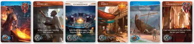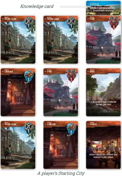 Return the components for any unused civilizations to the box. Shuffle your 15 Civilization cards. Deal out a grid of 9 face-up cards in 3 rows of 3 cards: this is your City.