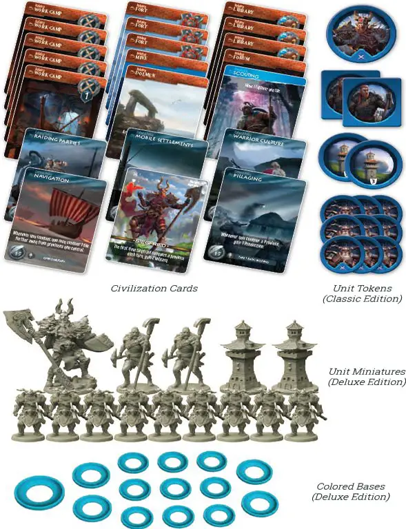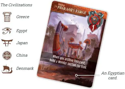 You may choose to play as one of five civilizations: the Chinese, Danish, Egyptian, Greek and Japanese. Each Civilization has a deck with cards common to all civilizations and several specific cards (1 Knowledge card, 1 Warlord card, 1 special Building, 5 Cultural Policies).