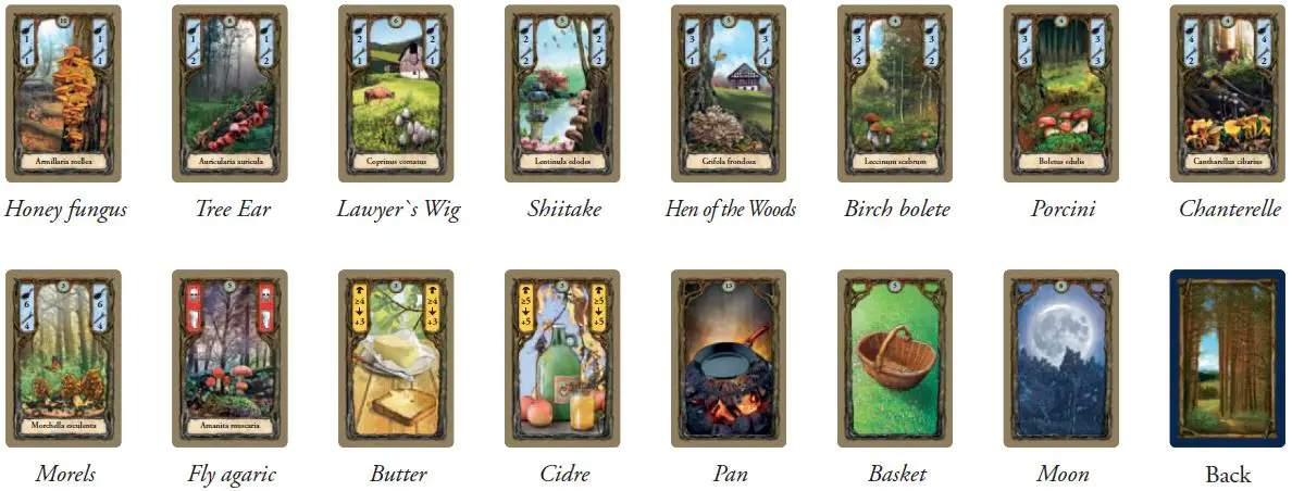 Mushrooms gathered under the glow of moonlight are even more delicious ... If you take a Moon card, put the card onto the discard pile and draw a Night card instead. Each type of mushroom (apart from the Morels and the Fly agaric) has 1 corresponding Night card.