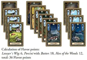 Now count the Flavor points of all the mushrooms you managed to cook. In the boxes on the upper left and right of each card right below the little pan symbol you can see exactly how many Flavor points you will get for each cooked mushroom.