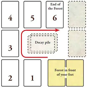 To signify this, put the pair of shoes card horizontally in front of these two cards. Keep a little space next to these two cards as well for the decay pile. (At the end of the rules you can also find an alternate way of forming the Forest).