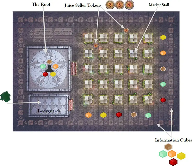 Randomly draw and place juice seller tokens face up on each of the corresponding spaces in the market. Pile the information cubes and gold coins near the game board; this is the supply.