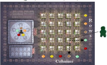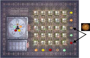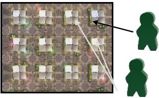 Example: The green player wants to place an assistant in the indicated stall. She must spend one of each of the corresponding cubes in the stall's market row (green) and column (brown).