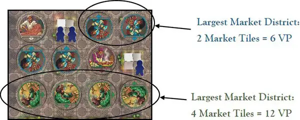 - Largest market area - 3VP per market tile in your largest contiguous group of claimed stalls.