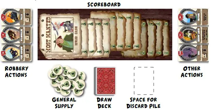 Each player places an Outlaw Character Token and the corresponding Player Aid in front of them on the table.