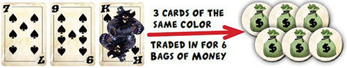 When you need to draw a card but the Draw Deck is empty, shuffle the Discard Pile to form a new Draw Deck. Each of the first three times you shuffle the deck, flip a Robbery Action Card in the order shown below. For the remainder of the game, that action will be worth more points.