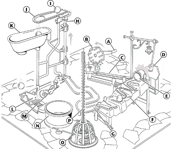 Awhich rotates the gearsBcausing the leverCto move and push the stop sign against the shoeD. The shoe tips the bucket holding the metal marbleE.The marble rolls down the rickety stairs