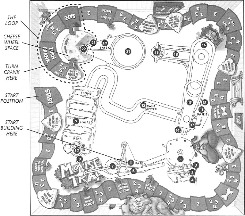 Example: If you are the first player to land on a Build space, you would place part #1 (Base A) on the game- board. The next player to land on a Build space would position part #2 (Gear Support) in place and so on until the Mouse Trap is completed.