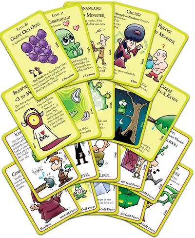 Divide the cards into the Door deck and the Treasure deck. Shuffle both decks. Deal four cards from each deck to each player.
