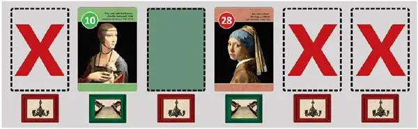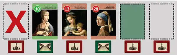 Although players have many choices about where to place their cards, Paintings in the same Gallery must never be placed out of sequence based on the exhibit number of each Painting.