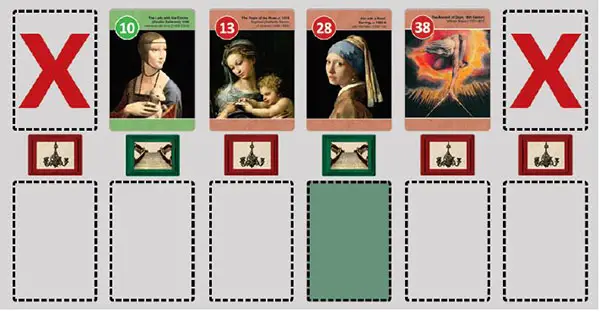 For example, if a 25 is already in play in a Gallery and you want to play a 35 card in that same Gallery, it must go in one of the spaces to the right of the 25.You may skip as many numbers and spaces as you like between Paintings as long as they still go in correct order. For example, you may place a 25 immediately to the right of a 5 if you like. You may also put a 6 more than one space to the right of a 5 if you like.