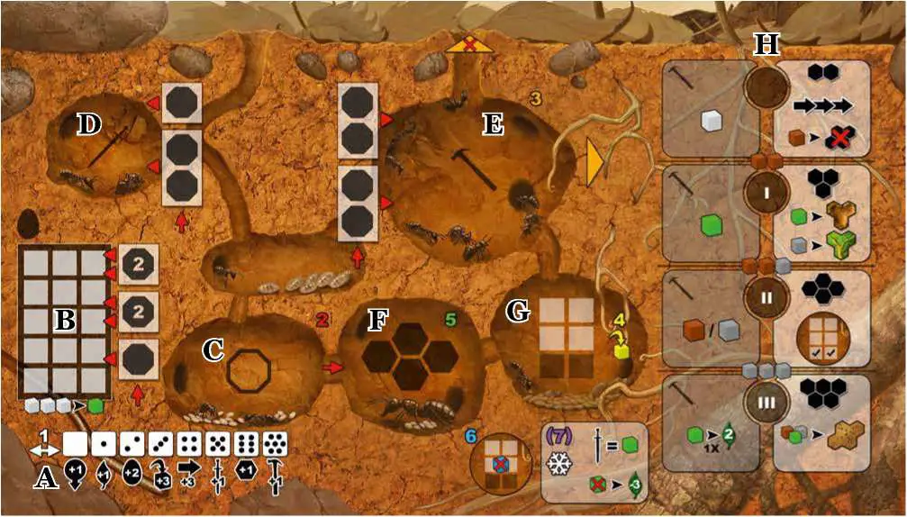 C Garden area: the workers which leave the individual board of each player will exit from a tunnel. They will then move over the terrain and will be able to place pheromones (which will give them access to resource cubes), clean up empty pheromones (to make space), hunt prey (by discarding soldiers) or place special tiles (but only if they've developed the ant colony).
