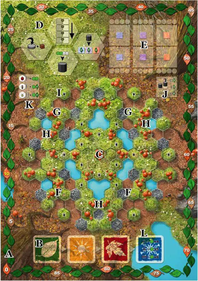 Event: for each season an event will be determined by the die for that season. During this phase, the players will be able to modify that event by spending larvae. The events allow players to obtain special bonuses for the season.