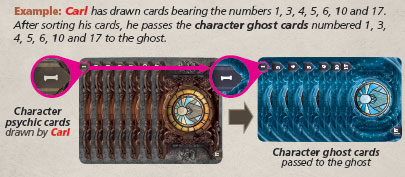 Look through the character ghost cards and select the ones whose numbers match the drawn character psychic cards; pass these to the ghost. Place the character psychic cards faceup next to the character progress board.