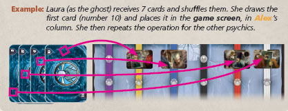 The ghost shuffles the received character ghost cards and draws as many cards as there are psychics in the game. He places these in the character spaces on the inside of the screen, in the columns representing the colours of the various psychics. Return any remaining cards to the box without looking at them.