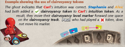 Any psychics who played a clairvoyancy token move their marker forward 1 space on the clairvoyancy track. The psychic returns his intuition token to the same progress board from which it was taken, and retains his vision cards in front of him. In each subsequent turn, the ghost will provide 1 or more additional cards to enhance the vision, until either the correct psychic card is picked or the game ends.