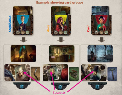 The psychics remove their combinations of 3 cards from their sleeves and associate them with the numbered tokens, forming several groups of cards in the center of the table, each containing 1 suspect.