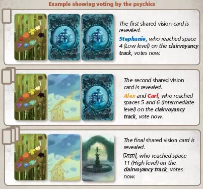 The psychics vote in secret, and cannot communicate with each other during the procedure. Psychics vote at different times, depending on their clairvoyancy level, as determined by the position of their clairvoyancy level marker on the clairvoyancy track.