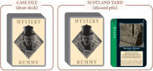 The remainder of the deck is placed face down in the center of the table, and the top card is revealed and placed face up next to the deck. This forms the discard pile. The draw deck is called the "Case File" and the discard pile is called "Scotland Yard".