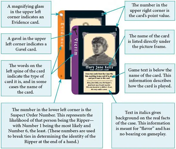 There are two main types of cards used in this game: "Evidence cards" and "Gavel cards". Most of the time you will be trying to catch "Jack the Ripper" by making melds (three or more of a kind) of Evidence cards. The Gavel cards will help players trying to catch Jack as well as the player who may be trying to escape. They provide a strong strategic element to the game not found in traditional rummy.