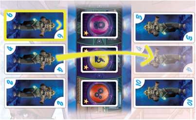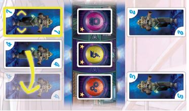 Cards with a vertical arrow (values of 6 and 9) allow players to send another Diver card to the empty space on the opposite side and directly across from its current position. The moved card must be, initially, on the same side as the card with the arrow has been played.